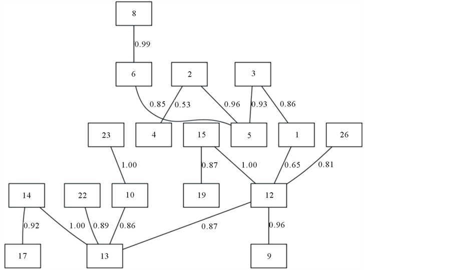 Figure 4. Consensus network of co-evolving sites in the HVR1 region of an HCV quasispecies population. Each node, represented by a square, corresponds to a residue in the HVR1, numbered according to their relative position to the HVR1 of HCV isolate H77 (genotype 1). The posterior probability of correlated substitutions between each pair of sites is indicated by numbers between the two sites.