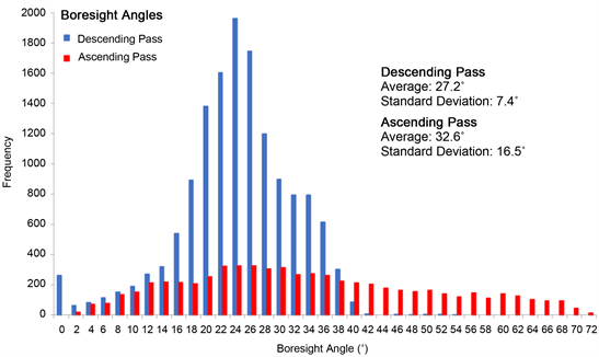 Figure 8. A comparison of boresight angles for descending and ascending passes shows markedly different distributions. Descending passes have a relatively tight grouping centered around 24˚, while the ascending passes are spread across the spectrum with values ranging up to 72˚.