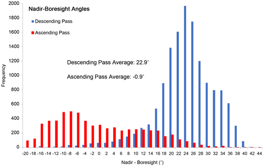 Figure 9. A comparison of nadir minus boresight angles is shown for descending and ascending passes. Ascending passes are more variable with an overall negative value, while descending passes are 98.2% positive with a strong peak between 20˚ and 30˚.