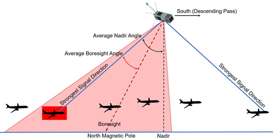 Figure 10. A schematic is shown for a descending pass to illustrate the distribution of nadir angles observed in Figure 7(a). The strongest signal direction relative to satellite nadir as predicted by propagation model is indicated in blue. The CanX-7 radiation pattern is shown in light red (±30˚ beam) with the boresight aligned with the north magnetic pole. The CanX-7 radiation pattern and the preferred signal direction must line up for contact. Only the aircraft highlighted in red is in contact. Aircraft to the right in the diagram will be detected as CanX-7 moves southward. Contact closer to nadir can occur, but the schematic describes the dominant trend in the data.