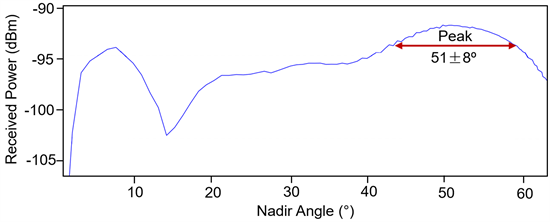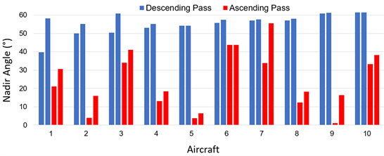 A significant contrast was observed in nadir angles for descending and ascending passes (Figure 7). The average nadir angle measured for descending passes was 50.1˚ with a standard deviation of 7.9˚. These values compare favorably with the ADS-B propagation model, which predicts the strongest aircraft signals