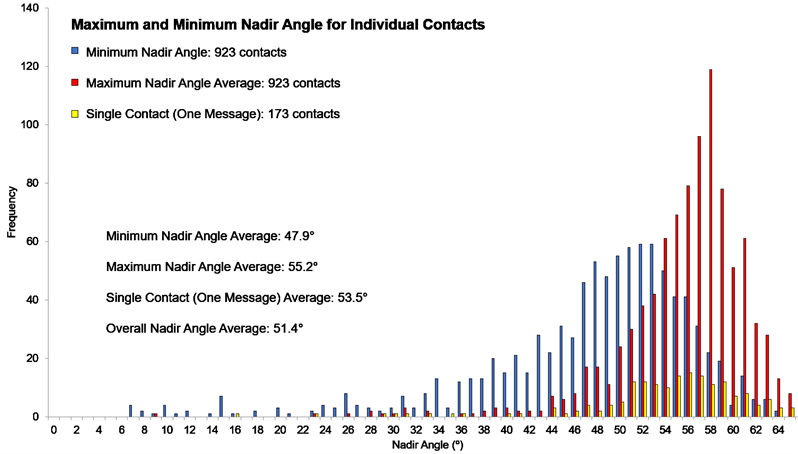 Further analysis was carried out on the descending pass to determine if aircraft with many consecutive messages influenced the prominent peak observed in the data in Figure 7(a). The minimum and maximum nadir angle was recorded for 1,096 different contacts, which included 173 single-message occurrences (Figure 14). The results showed an average minimum to maximum nadir angle range of 47.9˚ to 55.2˚, with single-message contacts averaging 53.5˚. The overall nadir