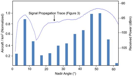 Figure 15. Message density per square kilometer in 5˚ bins based on minimum and maximum nadir angle is compared to the signal propagation model shown in Figure 3. There is a good correlation between observation and the model.