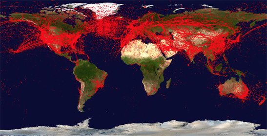 Figure 1. Composite of aircraft position messages received by the ADS-B payload on CanX-7, October 2016 to April 2017 [14].