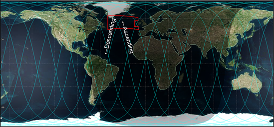 Figure 2. CanX-7 ground track for a typical 24-hour period with descending and ascending passes is shown over the AO highlighted in red [13]. The ground tracks move westward each day, resulting in coverage over the central portion of the AO for two passes and peripheral coverage for two additional passes. Image created with Systems Toolkit Software (STK), from Analytical Graphics Incorporated (AGI).