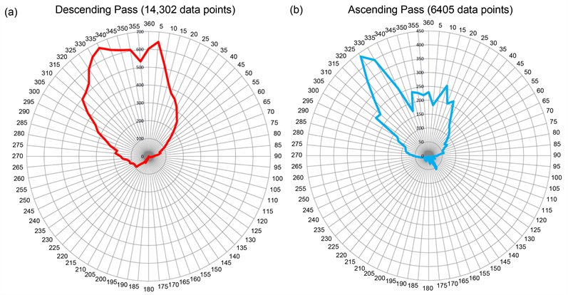 Figure 4. Polar plot of CanX-7 radiation pattern for (a) descending and (b) ascending passes. Each point on the respective outline is established by the overall number of messages (vertical axis) received at that azimuth angle in relation to the spacecraft. The north-northwest bias is a function of the satellite magnetic torquer attitude control system. The ascending pass pattern is notably less ordered than the descending pass, which may be a function of fewer data points or an issue with the magnetic torquer as the satellite moves northward.