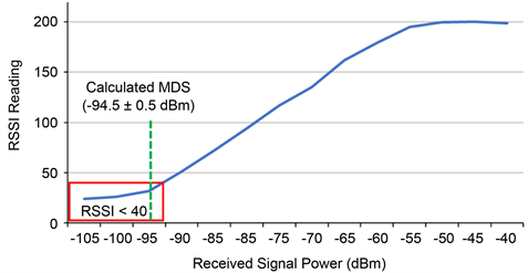 Figure 5. RSSI versus received signal power for the CanX-7 ADS-B payload. For this study, 95.8% of the received signals were close to the receiver MDS with an RSSI less than 40. Low RSSI values commonly showed high variability between consecutive messages originating from the same aircraft, suggesting potential inaccuracies for these values.