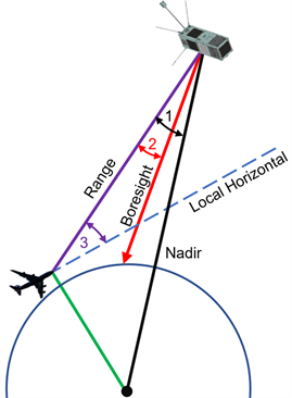 Figure 6. The determination of aircraft and satellite position at a specific time allows the calculation of range. The calculation of nadir 1) and boresight 2) angles based on elevation angle 3) relative to the local horizontal of the aircraft was determined through vector analysis. An elevation angle of zero degrees results in a maximum nadir angle of 64.4˚ and a range of approximately 3100 km.