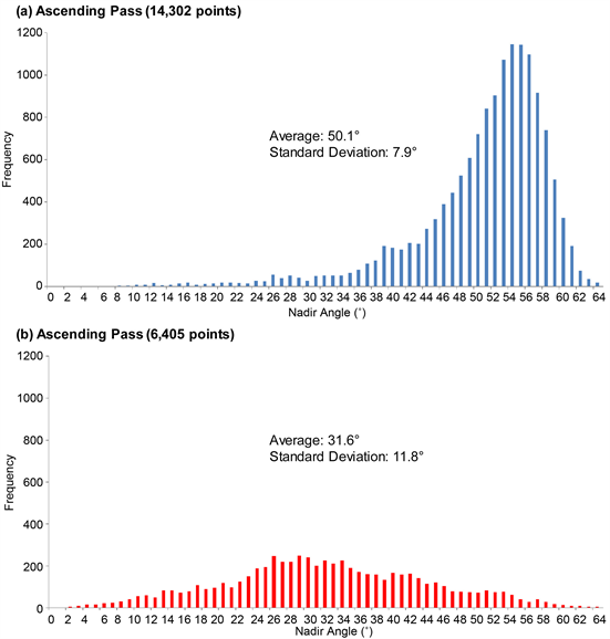 3) For ascending passes the average boresight and nadir angle are almost equal, which should result in a greater number of low nadir angles than seen in Figure 7(b). This provides further evidence that the boresight is not aligned with the north magnetic pole.