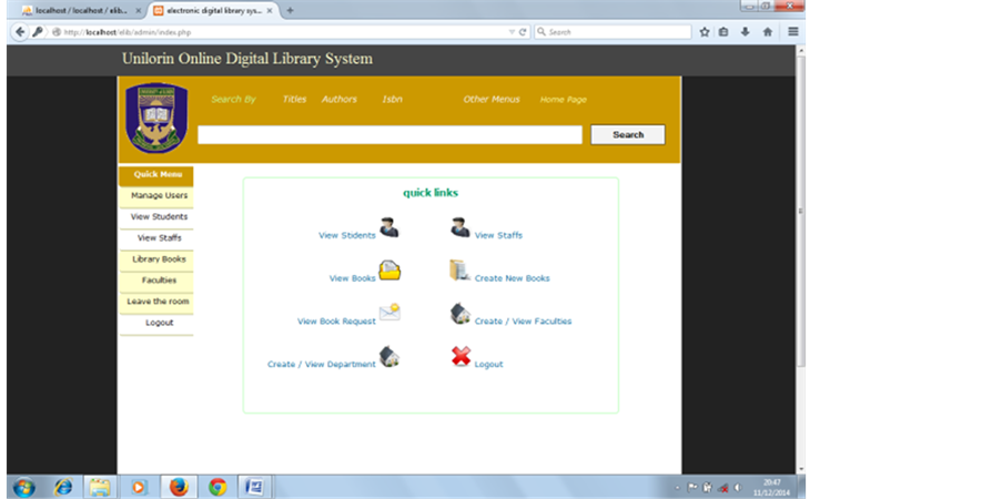 The home page screen depicted in figure 4, contains four major modules which are the Search, Registration, Request and Login while the Admin module home page shown in figure 5, contains Sub-module which are view students, view staff, view books, create new book, view book request, create/view facilities, create/view department, logout. Each of them will lead you to its database when clicked and manipulated.