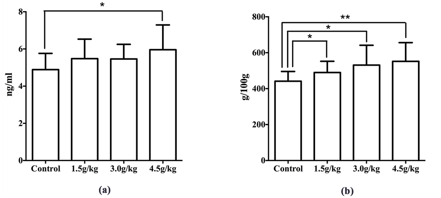 As shown in Figure 2, the serum testosterone levels of these rats increased after treatment with GT, and the result in 4.5 g/kg group was significantly higher than the control (5.96 ± 1.33 ng/ml vs. 4.89 ± 0.87 ng/ml, p < 0.05). Similarly, the ITT concentrations in each group were also significantly improved after GT administration (the control group: 441.5 ± 54.05 ng/g; the 1.5 g/kg group: 489.7 ± 62.59 ng/g, p < 0.05; the 3.0 g/kg group: 531.1 ± 110.5 ng/g, p < 0.05; the 4.5 g/kg group: 552 ± 104.02 ng/g, p < 0.05).