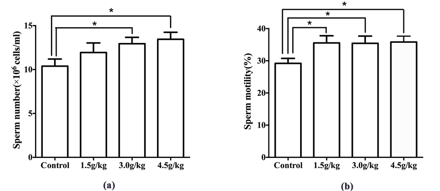 To determine whether the quality of semen changed after the treatment of GT, sperm number and motility were analyzed. As shown in Figure 3, the sperm number in groups treated with GT at dose of 3.0 g/kg and 4.5 g/kg