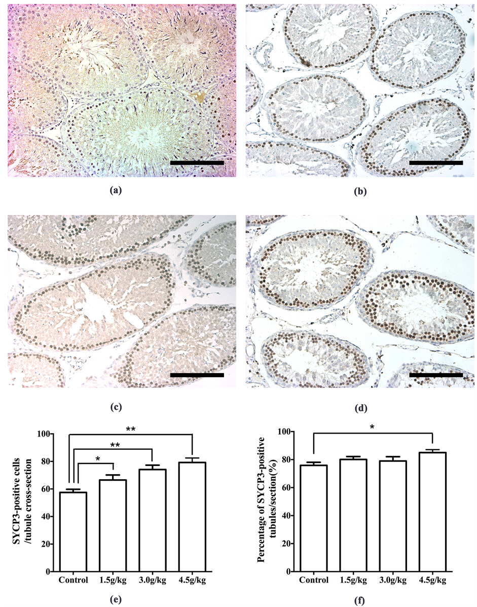 Figure 4. The SYCP3 expression in testis tissue of rats after GT administration. Immunohistochemical detection of germ cells immunopositive for SYCP3 is shown in (a) control group, (b) 1.5 g/kg group, (c) 3.0 g/kg group, and (d) 4.5 g/kg group. (e) Quantification of immunopositive cells per tubule cross-section is shown. (f) Comparison of percentage of SYCP3-posi- tive tubules/section between different groups. Data are shown as mean ± SEM; *p < 0.05, **p < 0.01; n = 10/group; bars = 50 μm.