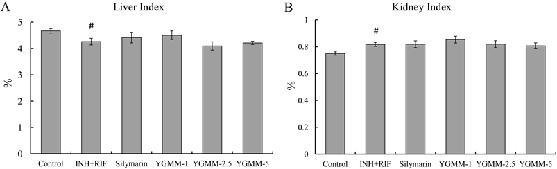 The silymarin group and YGMMs had no significant effect on decreasing kidney index compared to model group. With YGMM dose increased, the kidney index gradually decreased, which can be considered that YGMM has an effect on reversing kidney index to control level in a dose-dependent manner. There is no report on that INH and RIF co-administration can induce the increase of relative kidney weight. This is the first paper to report that INH and RIF co-administration has the effect on inducing kidney hypertrophy statistically.