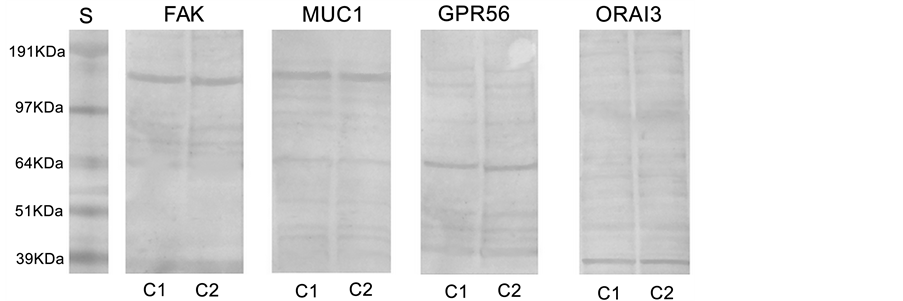Figure 2 shows results from western blotting assay. FAK presented a band at 125 kDa, MUC1 at 122 kDa, and less intense bands were found for GPR56 at 65kDa, and ORAI3 at 31 kDa.