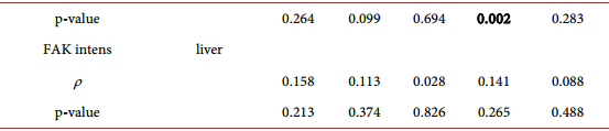 Table 5(C) shows correlation between the percentage of stained cells and intensity score for FAK in liver metastasis and primary colon carcinoma by means of Pearson Chi-square and Spearman Rank tests. Of utmost importance is a very strong, significant correlation with regard to percent of stained cells in primary colon carcinoma and liver metastasis (ρ = 0.565, p < 0.001), while the intensity score showed no correlation (p > 0.05).