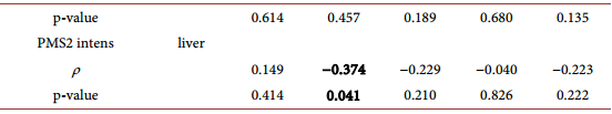 Table 5(H) presents correlations for PMS2 in liver metastasis and primary colon carcinoma. No statistically significant correlation was found with regard to percent of stained cells and intensity of staining for this marker (ρ = −0.207, p = 0.263 and ρ = 0.284, p = 0.121, respectively).
