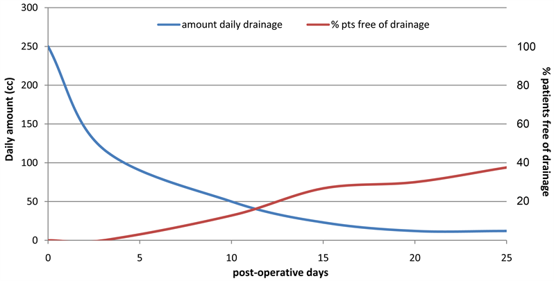 Postoperative care: All patients were instructed to reduce physical activity for the first week, to shower regularly, to record daily drainage fluid volume and to return to the hospital for weekly follow-up visits with a dedicated outpatient nurse team. Drainage was removed when 24-hour drainage fluid volume was less than 50 cc for two consecutive days (with patients instructed to return to the hospital the day after the first day drainage volume was <50 cc) or a maximum of 30 days after surgery.