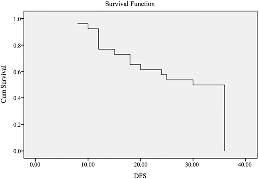 Figure 2. DFS in 32 patients treated with continuous 5-FU based concurrent chemoradiation (arm II). In month.