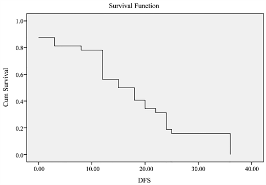 Figure 1. DFS for 33 patients treated with capecitabine and oxaliplatin based chemoradiation (arm I). In month.