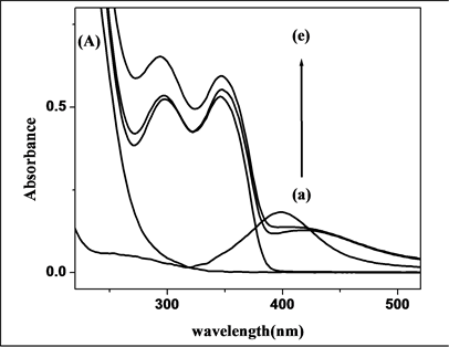 In order to explain the possible reaction mechanism of this CL enhancing phenomenon, the UV-Vis absorption spectra of the luminol-KIO4-Ag NPs-Co2+ CL reaction were recorded, as shown in Figure 4(A). It could be seen that KIO4 had no absorption (curve a), 22 nm Ag NPs (curve b) had a maximum absorption peak at around 398 nm, and luminal-KIO4 (curve c) system had two absorption peaks at 296 nm and 346 nm. Whereas, the light absorption of the mixed system (curve e) was approximately equal to the sum of the light absorption of the two individual systems, which implied that no change was taken between the species after the reaction. Therefore, the enhancement of CL signals may have originated from the catalytic effects of Ag NPs and Co2+.