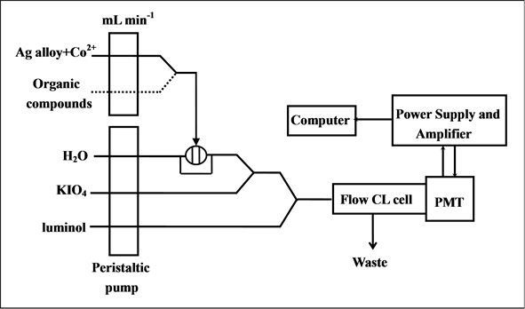 A diagram shown in Figure 1 illustrates the flow injection chemiluminescence detection system employed in this work. The solutions of luminol, KIO4 and carrier water were pumped into the flow cell by the peristaltic pump at the rate of 3.0 mL∙min−1, respectively. The Ag NPs colloid solution mixed with Co2+ was injected by a valve injector with a sample loop of 100 μL. The light output from the CL reaction was detected and amplified by the PMT and luminometer. The signal was imported to the computer for data acquisition. The net CL intensity ΔI = Is − Io was used for the quantitative determination, where Is and Io were the CL intensity of sample and blank solutions, respectively.