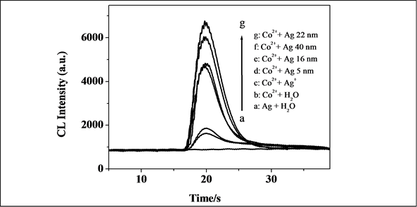 In this work, we have studied the kinetic characteristics of the CL reaction system, no obvious CL emission was observed when luminol was mixed with KIO4 in the absence of Ag NPs or Co2+. But when the Ag NPs with Co2+ solution was injected, a strong CL was detected from the luminol-KIO4 system, as shown in Figure 2. All the prepared Ag NPs in diameters of 5, 16, 22, and 40 nm could initiate the CL, and the most intense CL signal occurred for 22 nm Ag NPs. Although NaBH4 and AgNO3 solutions could enhance the luminol CL signal from the figure, their enhancement effects were much lower than that of the Ag NPs and Co2+ solution. Therefore, it can be concluded that Ag NPs mix with Co2+ can initiate the CL emission of luminol-KIO4 system.