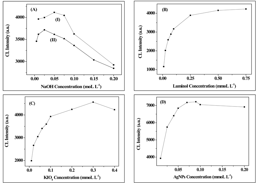 The effect of NaOH concentration was investigated. The range of NaOH concentration was from 0.01 to 0.2 mol∙L−1. As shown in Figure 3(A), (curve I), the luminous intensity of this system has significantly enhanced with the increase of NaOH concentration, but when the higher NaOH concentration led to a decrease in the CL intensity of this system. So a 0.05 mol∙L−1 NaOH concentration in luminol was used in consequent research work.