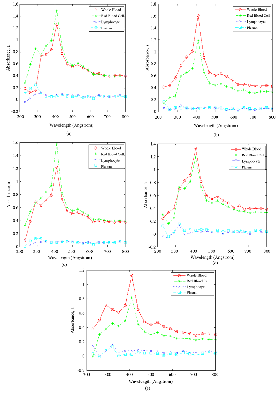 Figure 3. Absorbance, á versus Wavelength, λ for HIV positive blood components of patients that had not previously commenced antiretroviral drug treatment. (a) Drug 1; (b) Drug 2; (c) Drug 3; (d) Drug 4; (e) Drug 5.