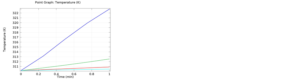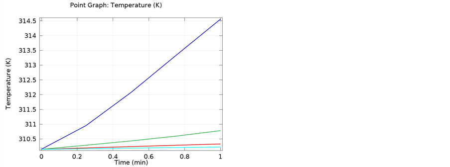 Figure 7. Four point distribution for the bone read throughout the bone materials at 900 MHz, demonstrating temperature distribution throughout the depth of the bone thickness. The curve also shows the thermal energy transmitted for one minute maximum.