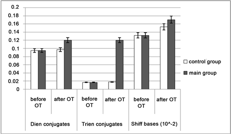 Figure 3. Blood lipid peroxidation intermediate products level in patient of control and main group (OT―ozone therapy; “*”―differences between the level of the parameter in the main and control groups are statistically significant, p < 0.0).