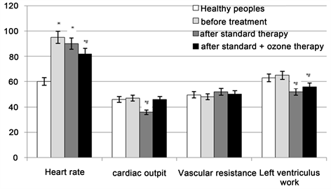 Figure 5. Central and peripheral hemodynamics parameters at traditional treatment of burn disease in connection with ozone therapy use (“*”―differences to parameter level before treatment are statistically significant, p < 0.05; “#”―differences to healthy people are statistically significant, p < 0.05).
