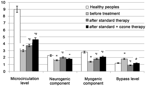 Figure 6. Dynamics of microcirculation state at traditional treatment of burn disease in connection with ozone therapy use (“*”―differences to parameter level before treatment are statistically significant, p < 0.05; “#”―differences to healthy people are statistically significant, p < 0.05).