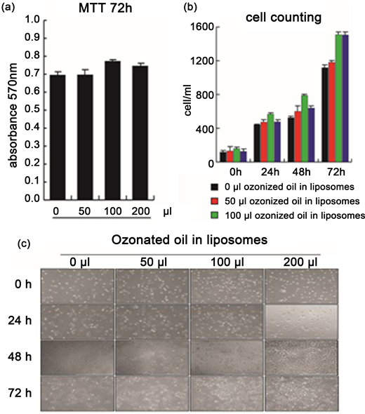ozonated oil solution in liposomes is able to promote cell growth after 72 hours of treatment compared to the control (Figure 5(b)). The data are supported by visual analysis via CytationTM 5 Cell Imaging Multi-Mode Reader (BioTeK) (Figure 5(c)).