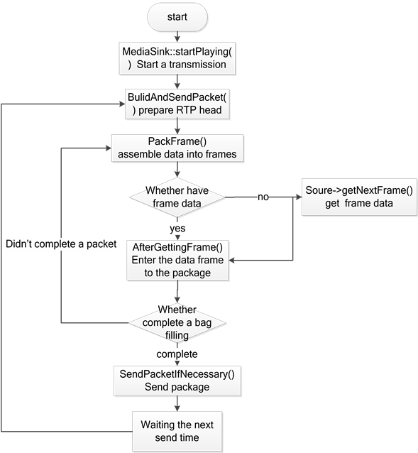 In Live555, the encoding modul of RTP is responsible for data packaging and transferring. The flow chart of RTP data transmission is shown in Figure 6.