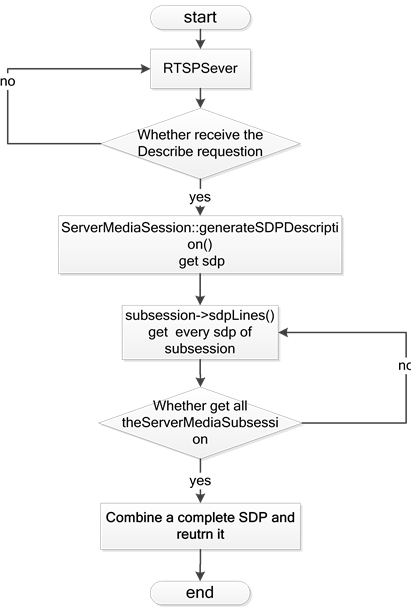 The function “Session” is used to handle the requests from a play back client and establish a connection between a data source and a consumer “sink”. When the “RTSPServer” receives a request “DESCRIBE”, it finds a corresponding “ServerMediaSession” and then call the “ServerMediaSession::generateSDPDescription()”. The “generateSDPDescription()” does a ergodic calling of “ServerMediaSubsession” used in the “ServerMediaSession” and obtains all the “sdps” from each “Subsession” through “subsession->sdpLines()”. Finally synthesizes all the “sdps” into a complete “SDP” and then return. The flow chart is shown in Figure 7.