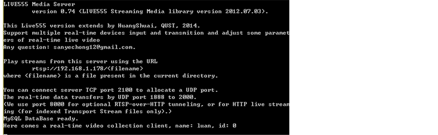 The implementation of multiple terminal connections in the system is based on the RTSP service mechanism in Live55. In the main thread of Live555, a command “env->taskScheduler().doEventLoop()” performs all the event loop. Command “DynamicRTSPServer” dynamically creates “RTSPServer”, which then establishes the RTSP server. In the “RTSPServer” an “RTSPClientSession” is defined to deal with every single client session. Through task scheduling, the server can handle every task given by “RTSPClientSession” and ensure multiple clients operating simultaneously.