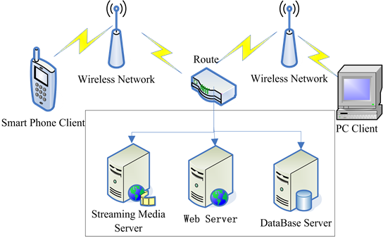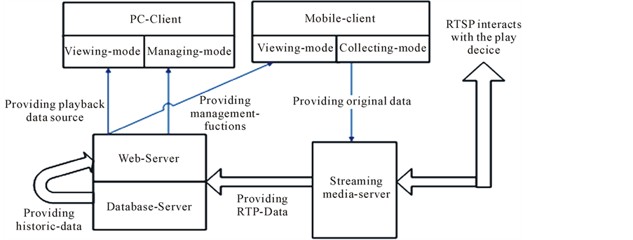 The live system, using the C/S architecture, can be divided into two parts of the server and client subsyem as shown in Figure 1. A client may be a smartphone or a personal computer. A smartphone can be used as a video data acquisition front-end and a play back end respectively, while a PC can only be a play back terminal. The server subsystem is comprised of three servers, a streaming server, a Web and a data base. The Web server designed using the B/S three-tier architecture is used for Keepping the server side and a client connected, releasing resources to the client, providing an operator an access entrance. The working principle of the interaction between a client and the server-side is shown in Figure 2.