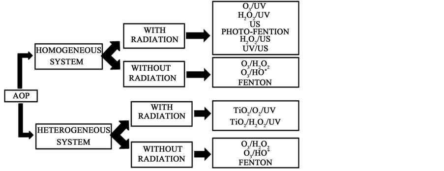 AOP are characterized by the generation of hydroxyl radical (HO•), nonselective oxidant with high reaction potential (Eo = 2.8 V), able to degrade even the most complex organic structures. These processes can be divided into homogeneous (catalyst and substrate or only substrate forming a single phase) and heterogeneous (catalyst and substrate forming two or more phases, with the catalyst generally being a solid). In turn, the generation of hydroxyl radicals can occur in the presence or absence of ultraviolet radiation [41] . When the reaction is complete, the hydroxyl radicals degrade the organic molecules into CO2, H2O and inorganic ions [4] [42] . Figure 2 presents the most used and investigated AOP.