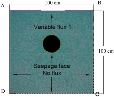 Figure 3 depicts the boundary conditions (BCs) of the transport domain with applying cavity. The upper boundary (AB) was specified as a variable flux 1 which defined by flash flood. The time variable BCs were implemented and adjusted dynamically depending upon the water level in the surface (AB) and conditions in the ponding domain. The BCs of both vertical sides (AD and BC) were subjected to no flux BC, since there is no flow happened across these boundaries. The cavity was represented as a circle of 11 cm radius, located at 30 cm beneath the variable flux 1 BC, assigned a seepage face BC. In this study, the water table was not considered, then there was no effect on the flow in the interest transport domain. Consequently, the bottom of the flow domain (CD) was subjected to a no-flux boundary condition since water infiltration is not reached the bottom for this experiment.