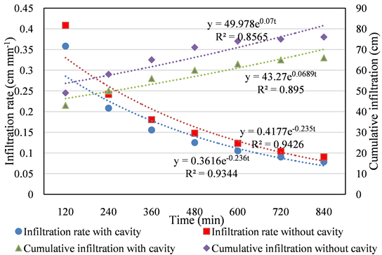 Figure 5 demonstrates the observed infiltration rates and cumulative infiltrations in both soil columns with and without applying cavity. Obviously the soil column with cavity showed lower infiltration rate than which of without cavity. After the WFs reached 42 and 49 cm depths of soil columns with and without loess cavity, respectively, the infiltration rates of both columns decreased promptly from the maximum value of 0.358 to 0.208 cm×min−1 for soil column with cavity and 0.408 to 0.241 cm×min−1 for soil column without cavity after one hour of starting the experiment and they kept decreasing gradually after experiment have done 8 hours. These stages kept continuous until the end. The measured total cumulative infiltrations were 66 and 76 cm for soil column with and without cavity, respectively. This means more water has been held up and stored in caving layer. As the evident of Figure 9, the both cumulative infiltrations increased steadily through the whole infiltration process until finishing experiment. This can be stated as a linear function of times at the later infiltration stage.