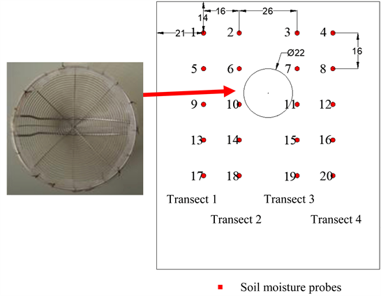 In order to study the soil water movement with loess cavity in soil column, the experiment was conducted using a cavity-making technique at the college of architectural hydrology and water resources engineering, Northwest A&F University, China. Two Plexiglas semi-circle containers of a height of 150 cm and 50 cm in diameter were used as the soil columns. To be a convenience for observing the wetting front advancements, the two plate sides of containers were gridded on lines in vertical and lateral direction (1 cm for each grid space). Soil sample, taken from Yangling, Shaanxi province, was silty clay loam soil. It was sieved through the filter of 4 mm in diameter, and filled into both soil columns. These soil columns were packed with three-layered soil at the thickness of 68, 24, and 28 cm for bottom, middle, and upper layer, respectively, and the quartz layers of 3 cm in thickness were laid on the upper surface in protecting soil erosion and texture damaged by applied water (Figure 1(a) & Figure 1(b)). One of soil columns was chosen to bury a half-sphere basket at 30 cm below soil surface (Figure 1(a)) for creating a loess cavity. This half-sphere basket was made from wire, and had a diameter of 22 cm. The time domain reflectometry (TDR) (Model CS605, Cambell Scientific) was utilized to measure the variation of volumetric water content in each soil layer. Its 20 moisture probes were horizontally installed at plate side of both containers in 5 lines (4 probes in each line) beneath soil surface at depth of 14 cm, 29 cm, 44 cm, 61 cm, and 76 cm (Figure 2).