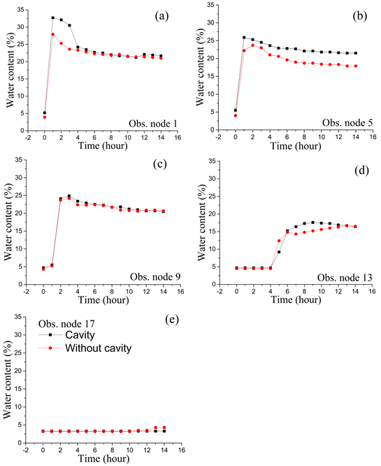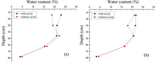 dropped down gradually after they reached the maximum value of 34% and 28% for the soil columns with and without loess cavity, respectively (Figure 6). Based on the presented curves, the WCs of applying loess cavity soil column in the upper layer (Layer I) and the middle layer (Layer II) (i.e. the observation probes at 28 cm and 30 cm cross section) was higher than those without applying loess cavity (Figure 6(a) & Figure 6(b)) and remains these states until the termination of experimental process. However, the WCs at the deep layer of without cavity soil column was initially rising remarkably for 4 hours after the starting the experiment, while those of cavity soil column was just increasing at one hour later (Figure 6(d)). Interestingly, it was found that the water distribution of without cavity column reached the deep layer (i.e. 78-cm depth) at 10 hours of experiment (Figure 6(e)). In contrast, remarkably, the WCs of cavity soil column in the horizontal 78-cm intersect did not change, even at the termination of experiment (Figure 6(e)).