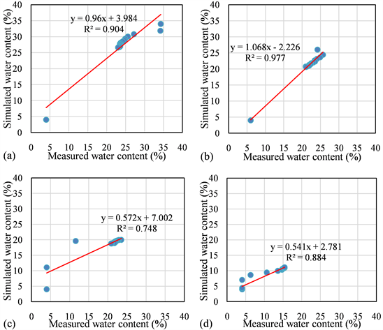 The single-porosity model of van Genuchten-Mualem was chose to determined soil hydraulic parameters by using HYDRUS-2D/3D Rosite for soil water retention and conductivity curves (Table 1). Noticeably, the saturated zone of ponded infiltration is not fully filled with water due to the entrapped air [56]. Figure 9 shows the observed and simulated water contents (WCs) for different depths, obtained by HYDRUS-2D/3D, for probes in vertical transect 2 closed to the cavity in the function of time as well as the associated scatter plots. The comparison between measured and simulated values of WCs with the determination coefficient (R2) in Figure 9 also showed that HYDRUS-2D/3D simulated WCs matched the corresponding observed results reasonably well for shallow surface layer which indicated a similar trend during the water infiltration process (i.e., in the depth of 30 cm). It can be found that the HYDRUS model has described the WCs adequately for the upper and middle layer which had a good determination