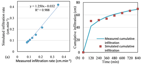 Figure 10. Comparison between HYDRUS-2D/3D and observed results: (a) infiltration rate, and (b) cumulative infiltration.