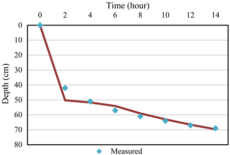 the termination of infiltration experiment, the measured and simulated advancing wetting depth approached the similar values of 69 and 69.66 cm, respectively. As seen in Table 2, the values of RMSE, EF, and NRMSE of simulated WF at 2 hours were 6.94, −16.24, and 15.61, respectively, which mean that the model simulation was overestimated the WF at the commencement of the infiltration process. Whereas, the simulated water fronts after 2 hours of infiltration process were capable to measured results. The RMSE values ranged from 2.62 to 1.6, while the NRMSE ranged from 3.76% to 4.73%, and EF values ranged from 0.06 to 0.64. However, in general, the simulated and measured WFs are fitting well together.
