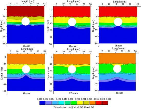 The HYDRUS-2D/3D model was used to investigate the water distribution in soil column with loess cavity for comparing to the experimental results. Figure 12 shows the spatial distributions of water contents in every two hours. As the evident of Table 2, the root mean square errors (RMSE) correspond to 6.94, 2.62, 1.88, 1.6, 1.72, 1.87, and 2.72 between the simulated and measured water