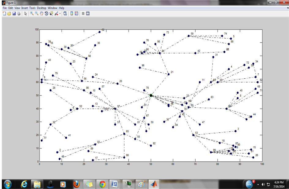 The sink node sends a beacon node which can reach up to radius R, where R is the communication range of a sensor node. When a sensor node, receives a beacon node, it initiates neighbor discovery based on HELLO packets and updates it’s neighbor information table. We consider all nodes which are at one hop distance to sink node are first level parent nodes or cluster heads. A node sends a JOINREQUEST packet for requesting for join operations. The parent replies with JOINREPLY along with TDMA schedule or CDMA code for further communication. Once the first level parent node joins to Sink node, then it broadcasts the information along with number hops to sink as one of the parameters. When a node receives these broadcast packets, then based on the nearest distance from sink node, a second level node joins to its parent and further continues the process of sending broadcast messages. This process continues until all nodes in the network joins to the network. Figure 2 shows the topology created for 100 nodes deployed in the area of 100 × 100 m area. The sink node is located at the center, and JOIN operation of each node is shown with dotted lines between two nodes. The node towards sink node are parent nodes for children nodes in the network.