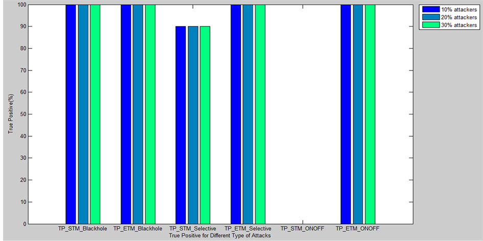 Table 3 shows the results for ONOFF attack. ONOFF attack is an attack, where a node initially tries to establish high trust value in its neighbors and then starts dropping packet (ON) and forwarding packet (OFF) for a certain period of a time in the fashion of cycles. We can observe that, the standard Bayesian trust model, does not detect ONOFF attack, where the exponential decrease Bayesian model detects ONOFF attack with 100%. Figure 3 shows percentage of True Positive (TP) for various kinds of attacks, with Standard and Exponential decrease Bayesian trust models. The results show that Exponential decrease trust model, performs better than Standard Trust model.