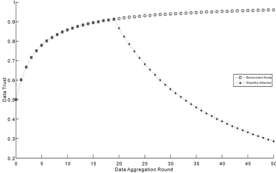 Figure 4. The trust value changes in benevolent and stealthy attacker for data aggregation rounds.